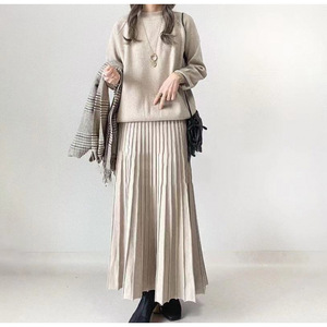 欧美亚马逊跨境外贸新款时尚通勤气质圆领纯色长袖压褶百褶裙套装