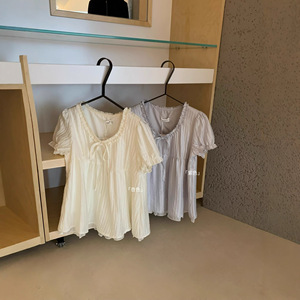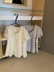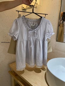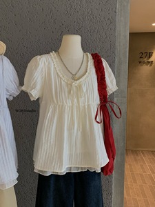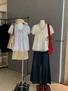 【WGWE】6744韩版百搭显瘦设计感小花边双层下摆小衫女短袖衬衫女