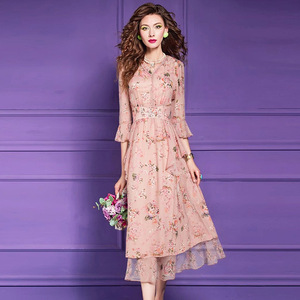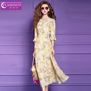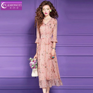 菲梦伊100桑蚕丝碎花连衣裙女喇叭袖秋装法式甜美真丝收腰长裙子