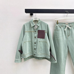 深圳南油新款时尚复古套装拼接皮牌系带宽松翻领牛仔外套+ 直筒裤