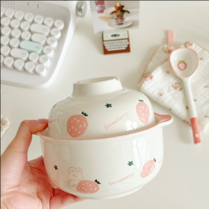 可爱陶瓷泡面碗带盖学生宿舍用饭碗防烫双耳汤碗方便面碗可微波炉