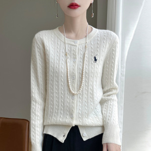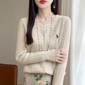 2025新款秋冬羊毛针织开衫女刺绣马麻花圆领开衫休闲简约外套