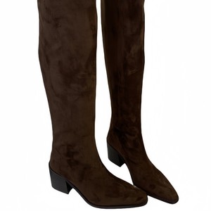 粗跟绒面堆堆长筒骑士靴女鞋2025年秋冬新款复古显瘦中长棕色靴子