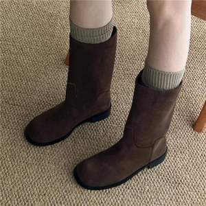 牛皮版~韩系宽筒真皮骑士中筒靴女粗跟西部靴复古厚底马丁靴短靴
