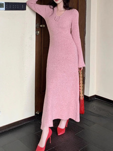 秋冬爆款针织连衣裙女装V领修身收腰包臀打底裙过膝毛衣紧身长裙