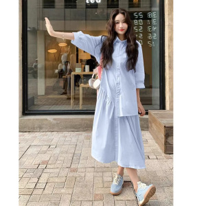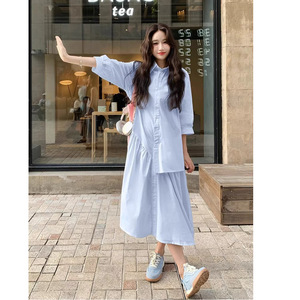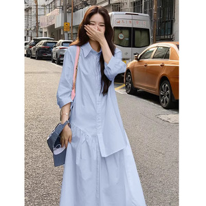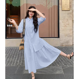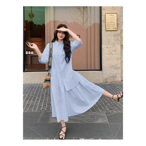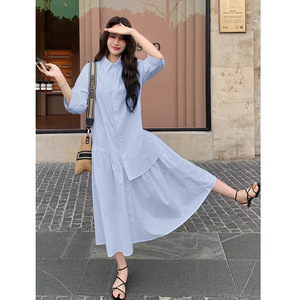 新品亚马逊欧美系连衣裙浅蓝色夏季穿搭减龄不规则衬衫裙设计感