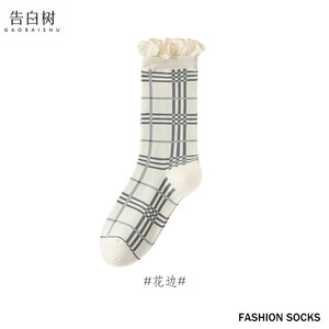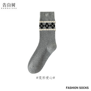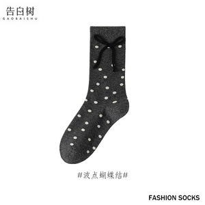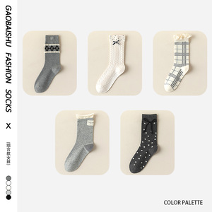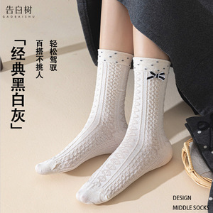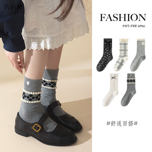 袜子女秋冬新款花边蝴蝶结爱心刺绣洛丽塔中筒袜吸汗透气无骨棉袜