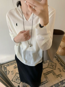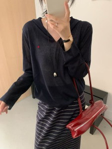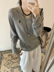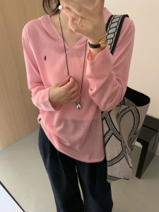 糖果色刺绣2025早秋新款V领连帽针织衫女宽松显瘦百搭长袖T恤上衣