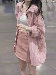 春秋多巴胺粉色衬衫女大码胖mm长袖防晒薄外套宽松慵懒开衫衬衣潮