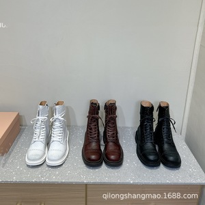 高端品质2025秋冬真皮圆头复古做旧厚底显瘦系带马丁靴骑士靴