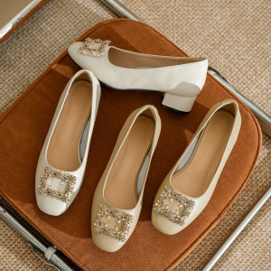 真皮粗跟奶奶鞋女浅口春秋水钻气质方头低跟单鞋软皮不累脚高跟鞋