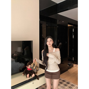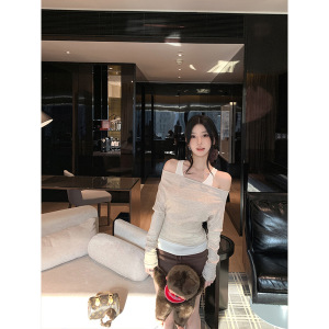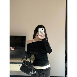 Moses魔西女王早秋韩版气质一字肩撞色假两件设计感长袖T恤上衣女