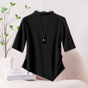 早秋半高领五分袖T恤女2025新款收腰设计感时尚弹力气质打底上衣