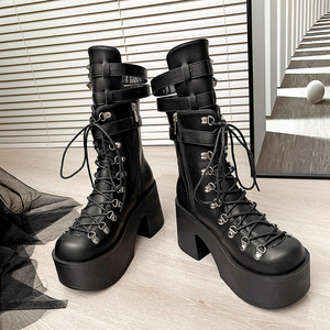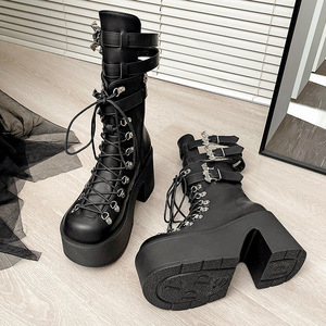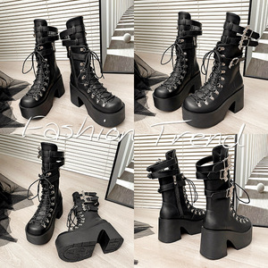 欧美外贸新款皮带扣厚底机车暗黑朋克风重工辣妹y2k女高筒长靴女