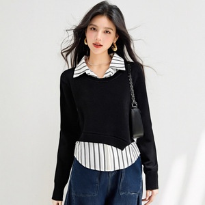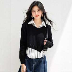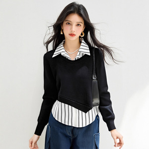 2025秋季新款韩版条纹衬衫假两件针织衫女气质职业面试长袖上衣
