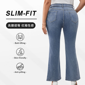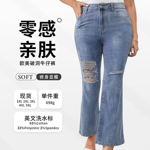 2025秋季新款大码牛仔裤时尚休闲破洞显瘦水洗喇叭大码牛仔长裤女