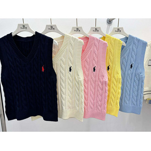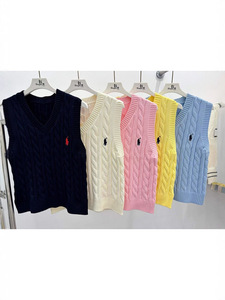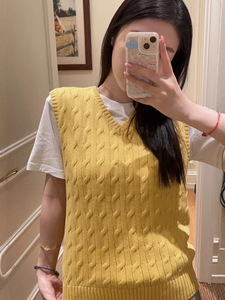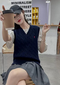 韩系针织女背心小马标刺绣麻花针织V领背心绞花无袖毛衣针织衫