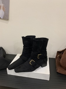 2025韩版新款小众设计复古法式短靴小方头西部靴绒面中筒靴女靴子