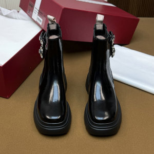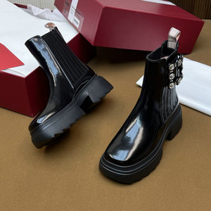 纯原渠道货!东莞高品质真皮女短靴厚底水钻方扣弹力套筒切尔西靴