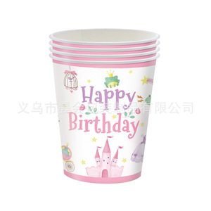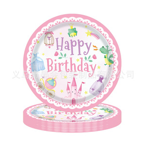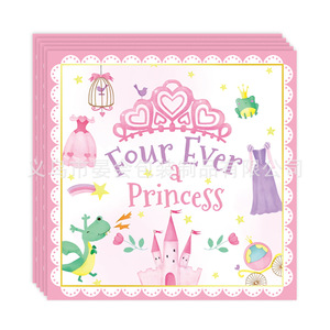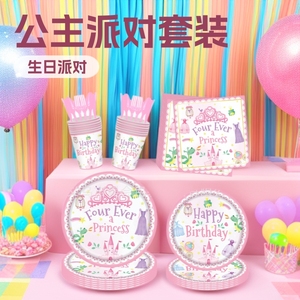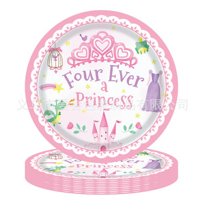 新款粉色四岁公主皇冠城堡儿童生日派对主题一次性纸杯纸盘套装