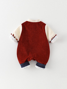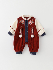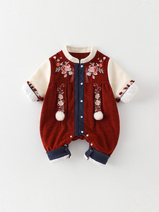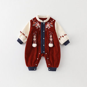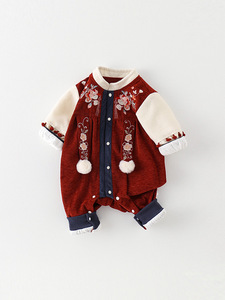 女宝宝春秋装中式周岁礼爬服秋季女童红色喜庆国风满月百天连体衣