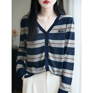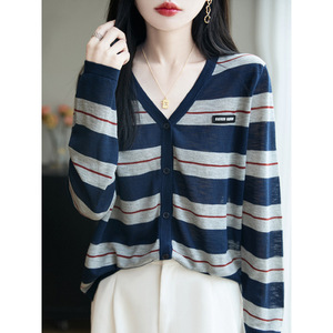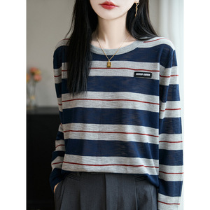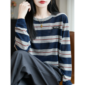 25年早秋新款竹节麻圆领针织衫长袖女拼色条纹宽松百搭打底衫上衣