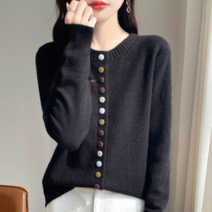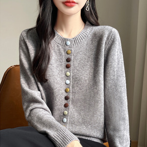 羊毛混纺2025秋冬新款宽松圆领彩扣假开衫套头针织衫毛衣外套