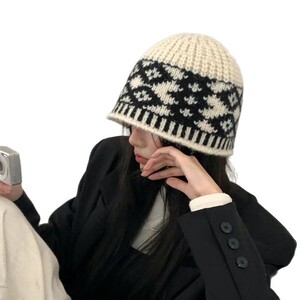 韩国新款小众设计感拼色菱形格针织渔夫帽女秋冬季毛线帽保暖帽子