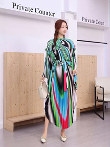 三宅蝙蝠袖连衣裙女春秋日系和服高级感褶皱洋气大码印花V领长裙