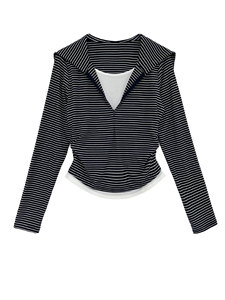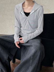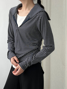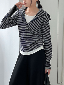 鹿西 假两件海军领针织长袖修身显瘦T恤女秋季新款韩系条纹2030