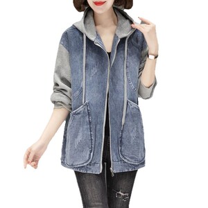 连帽牛仔外套女2025春秋新款拼接宽松大码短款拉链小个子春装上衣