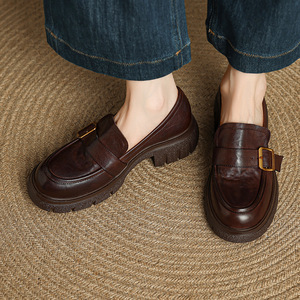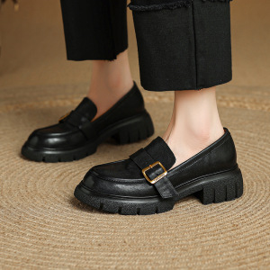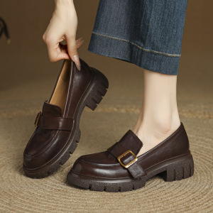 头层牛皮优雅干练通勤方扣厚底乐福鞋2025粗中跟圆头真皮深口单鞋