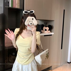 大码方领泡泡袖短袖t恤女夏季2025新款胖mm宽松显瘦遮肉外穿上衣