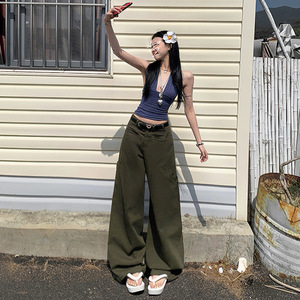 【今茵】2色/早秋新品美式复古甜酷辣妹前开袋铆钉设计休闲工装裤