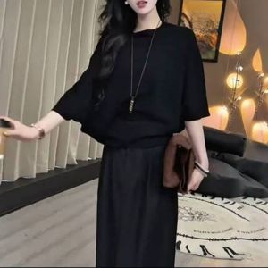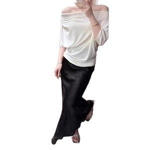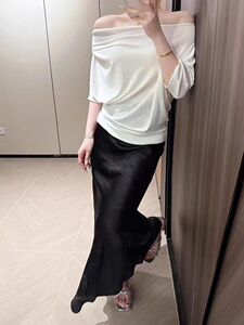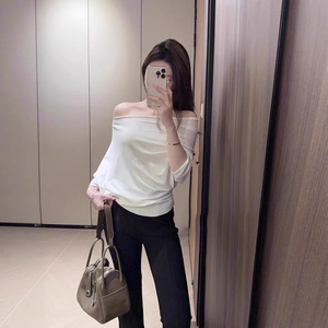 高级感灰色一字肩蝙蝠袖短袖t恤女夏季不规则短款冰丝针织上衣薄
