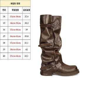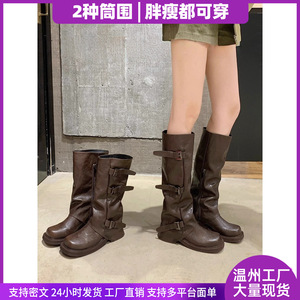 辣妹厚底裤管靴女小众设计烟筒靴褶皱扣带中筒西部骑士长靴堆堆靴