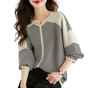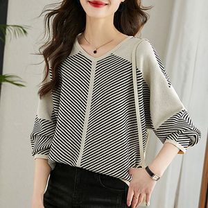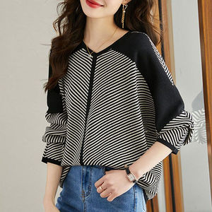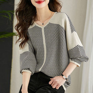 条纹毛衣女v领长袖上衣秋季2025年新款宽松遮肚针织衫洋气打底衫