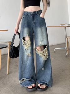 150小矮个子美式破洞牛仔裤女夏季高腰直筒拖地裤辣妹复古阔腿裤