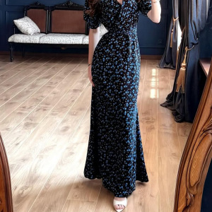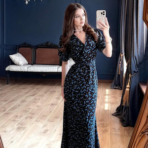 2025年夏季新款欧美亚马逊跨境外贸女装v领法式优雅碎花收腰长裙