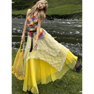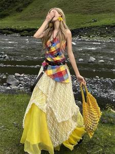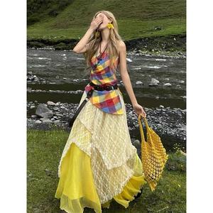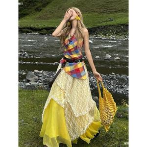 油画绝美叠穿三件套海边度假风穿搭蕾丝吊带上衣半身裙套装女夏季