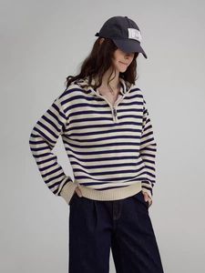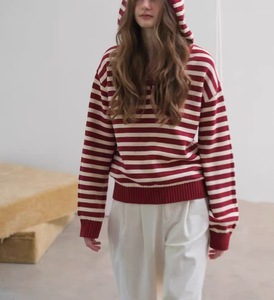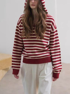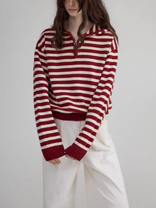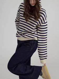 条纹航海家'北欧复古撞色条纹半开领拉链连帽针织毛衣女