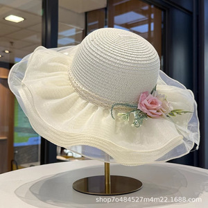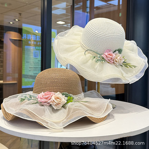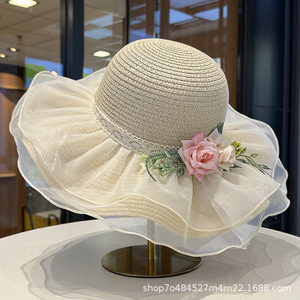 草帽女海边沙滩波浪边大帽檐遮阳防晒帽2025夏季新款法式蕾丝花朵