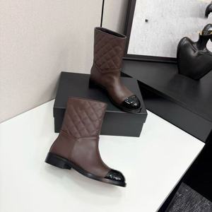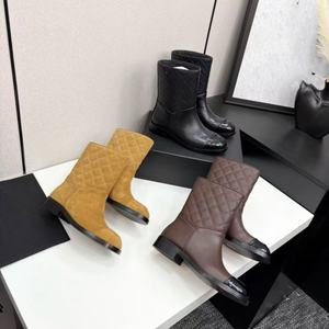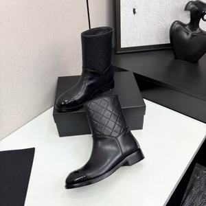 2025秋冬季新款圆头粗跟厚底中筒靴时尚百搭舒适拼色菱格纹时装靴
