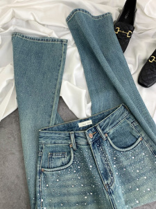 2025春季TOP烫钻牛仔裤女高腰直筒显瘦水洗蓝色窄版拖地阔腿裤女
