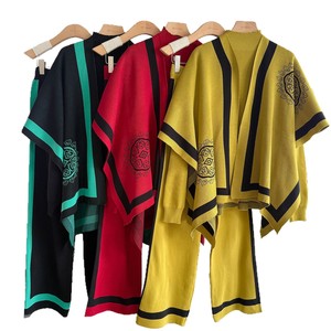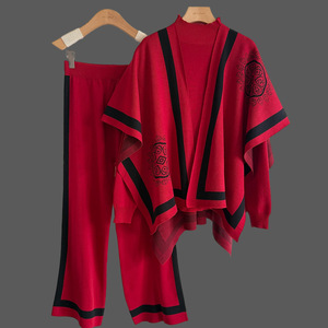 跨境休闲套装女秋冬新款气质慵懒风针织毛衣披肩斗篷阔腿裤三件套