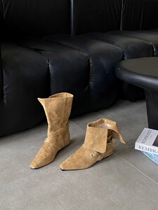 皮带扣坡跟短靴女韩版尖头短靴2025秋冬新款牛翻皮套筒欧货靴子