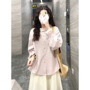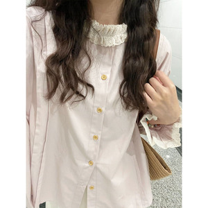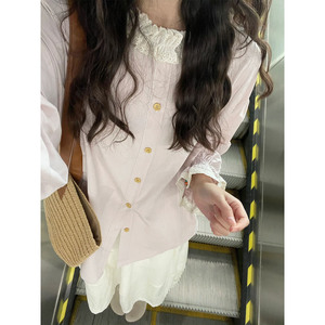学院风文艺气息花边圆领粉色长袖衬衫女新款宽松
