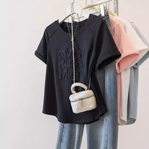 大码字母绣花鱼骨短袖t恤女夏季2025新款胖mm宽松显瘦遮肉上衣女