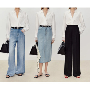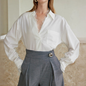 现货厂家批发 穿搭衬衣 蕾丝拼接V领直筒衬衫女 设计感 休闲上衣