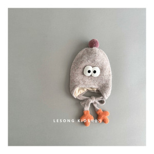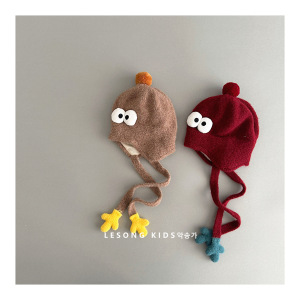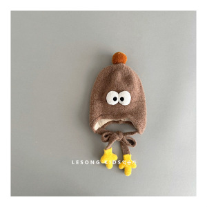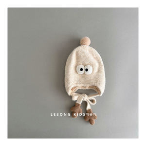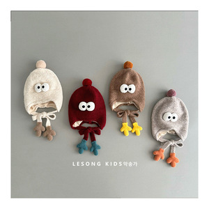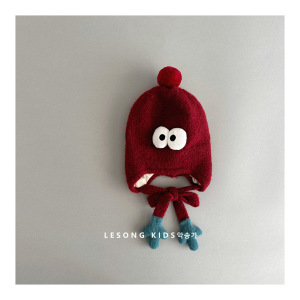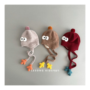 韩版搞怪婴儿毛绒帽秋冬季可爱眼睛小手男女童保暖绑带针织护耳帽